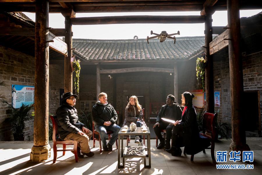 这是新华社记者缪晓娟(右一)在安徽省六安市金寨县大湾村采访四位受邀到这里参观访问的外国人。左起:植国明、肖恩、瑞贝卡·尼什、乌俊杰(2020年12月20日摄)。新华社记者郭沛然 摄