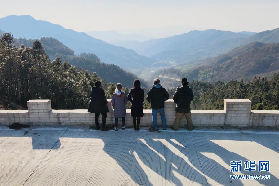 新华社记者缪晓娟和植国明、肖恩、瑞贝卡·尼什、乌俊杰在山间观景(2020年12月20日摄,无人机照片)。新华社记者 陈诺摄