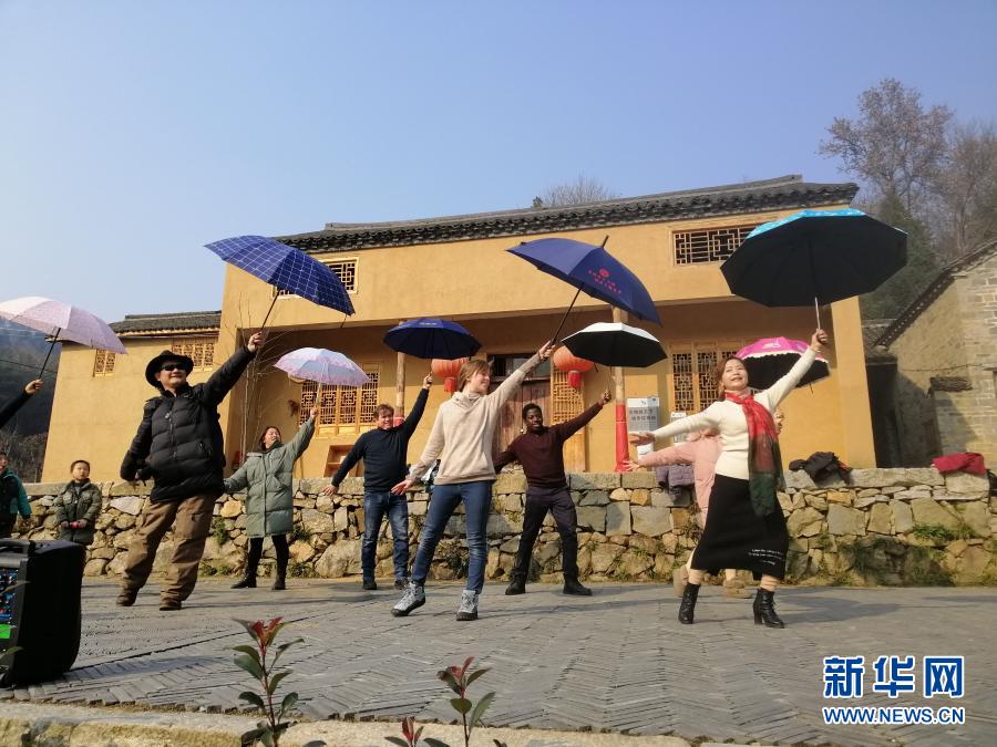 这是2020年12月19日,植国明、肖恩、瑞贝卡·尼什、乌俊杰与村民们一起练习舞蹈,迎接新年。新华社记者 刘方强摄