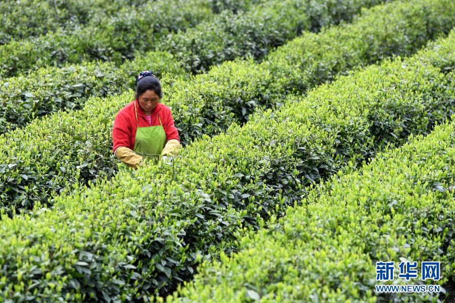金寨县花石乡大湾村村民在茶产业扶贫基地里采茶(2020年4月17日摄)。新华社记者刘军喜摄