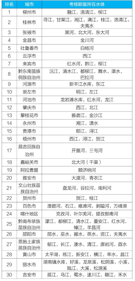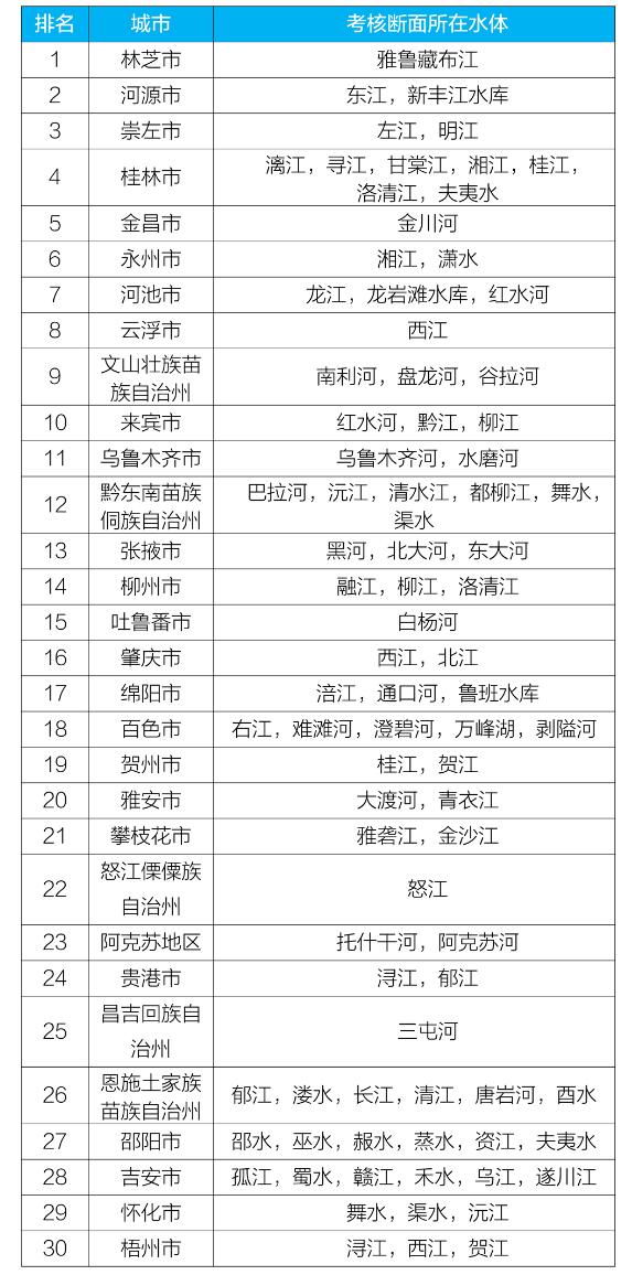 参加排名的全国地级及以上城市,覆盖2050个国控断面(其中1940个为国家地表水考核断面,110个为入海控制断面)。2020年12月,全国地级及以上城市中,林芝、河源和崇左市等30个城市国家地表水考核断面水环境质量相对较好(从第1名至第30名),东营、庆阳和铜川市等30个城市国家地表水考核断面水环境质量相对较差(从倒数第1名至倒数第30名)。2020年1-12月,全国地级及以上城市中,柳州、桂林和张掖市等30个城市国家地表水考核断面水环境质量相对较好(从第1名至第30名),铜川、沧州和邢台市等30个城市国家地表水考核断面水环境质量相对较差(从倒数第1名至倒数第30名);营口、吕梁和东莞市等30个城市国家地表水考核断面水环境质量变化情况相对较好(从第1名至第30名),铜川、东营和海口市等30个城市国家地表水考核断面水环境质量变化情况相对较差(从倒数第1名至倒数第30名)。详细见附表1~附表6。