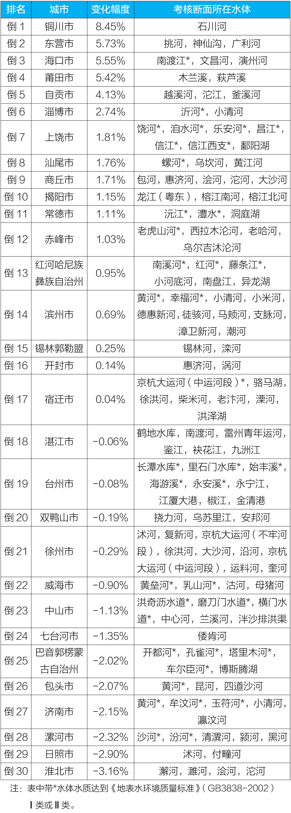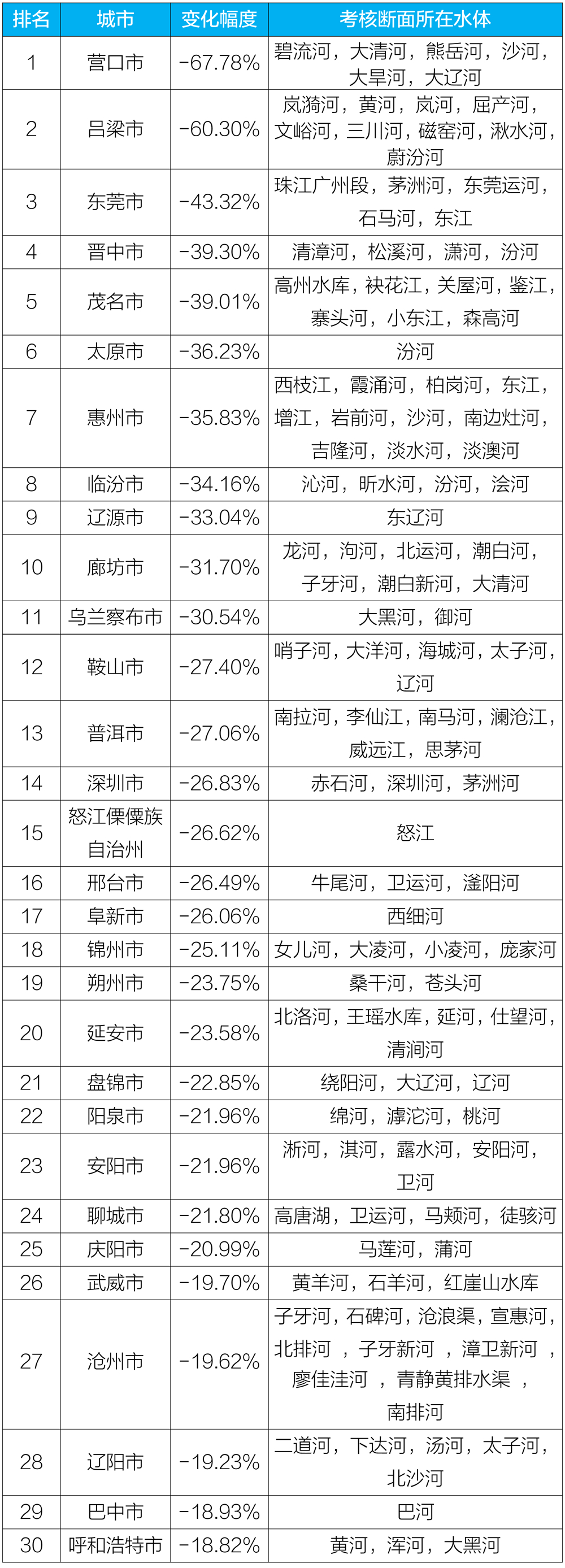 附表5:2020年1-12月国家地表水考核断面水环境质量变化情况排名前30位城市及所在水体