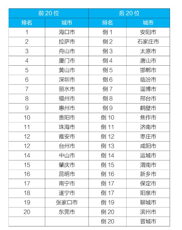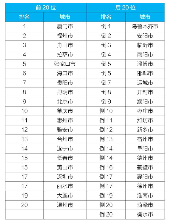 12月,168个重点城市中,乌鲁木齐、安阳和临沂市等城市空气质量相对较差(从倒数第1名至并列倒数第20名);厦门、福州和舟山市等城市空气质量相对较好(从第1名至第20名),见附表7。