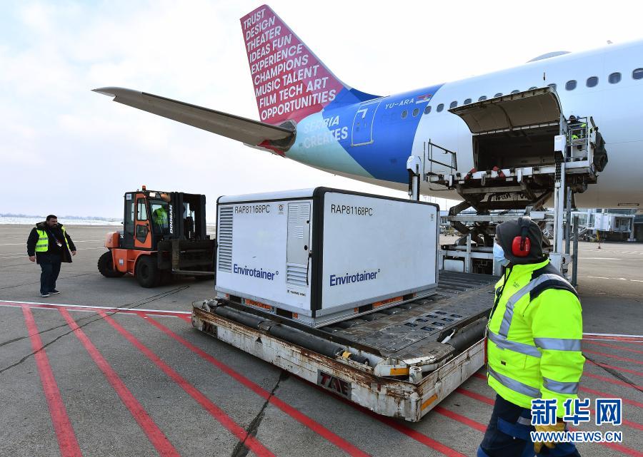 1月16日,在塞尔维亚首都贝尔格莱德,机场工作人员卸载首批100万剂由中国国药集团生产的新冠疫苗。新华社发(普雷德拉格·米洛萨夫列维奇 摄)