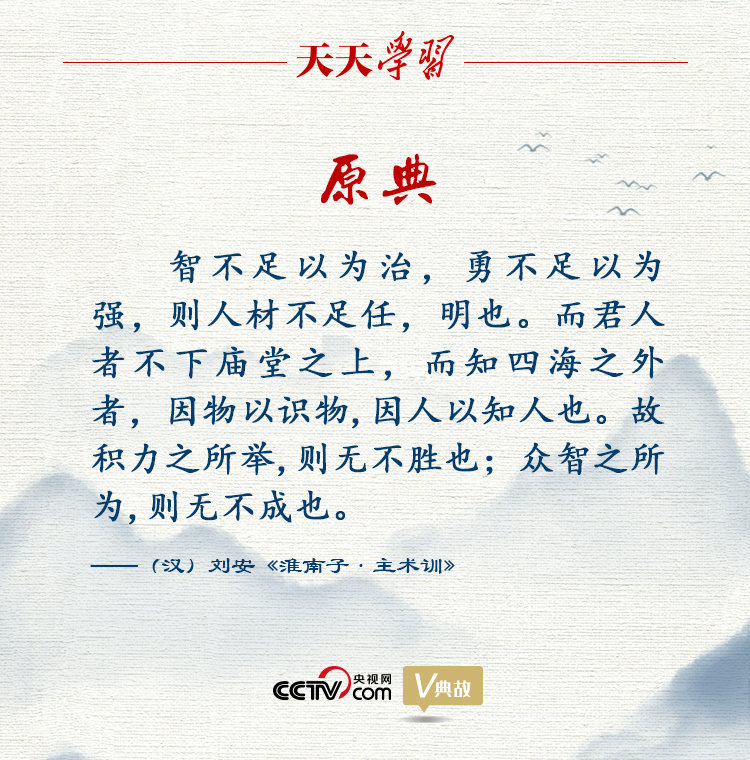 事实上,早于《淮南子》300多年的《文子》也有类似表述:“夫人君者,不出户以知天下者,因物以识物,因人以知人。故积力之所举,即无不胜也;众智之所为,即无不成也。”