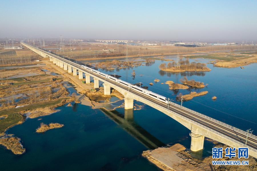 运行试验动车组列车通过徐连高铁沂河特大桥(2021年1月8日摄,无人机照片)。徐连高铁位于江苏省北部黄淮平原地区,西起徐州市,东至连云港市,正线全长约180公里。新华社记者 季春鹏 摄