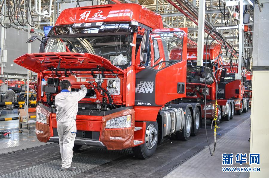 工人在位于长春的一汽解放总装车间装配车辆(2021年1月5日摄)。1月18日,国家统计局发布数据,2020年,我国国内生产总值(GDP)首次突破100万亿元大关。新华社记者 张楠 摄