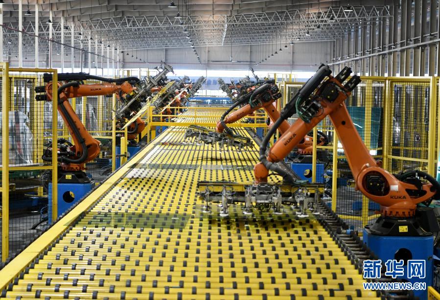 在福建省福清市的福耀玻璃集团汽车玻璃生产车间,机械手在生产线上作业(2021年1月12日摄)。新华社记者 姜克红 摄