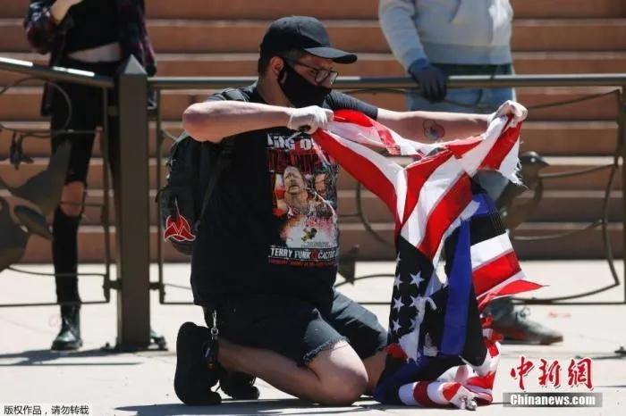 资料图:当地时间2020年5月29日,美国丹佛,示威者撕毁了一面美国国旗。