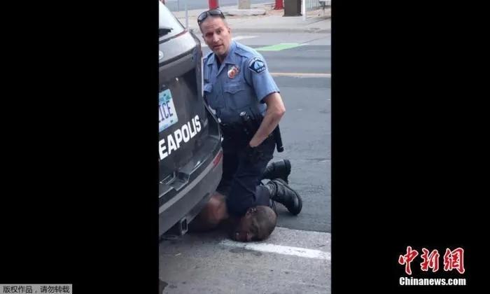 当地时间5月25日,美国明尼苏达州明尼阿波利斯市一名警察在逮捕非裔男子乔治·弗洛伊德时,将其按在地上,用膝盖顶住脖子。(视频截图)