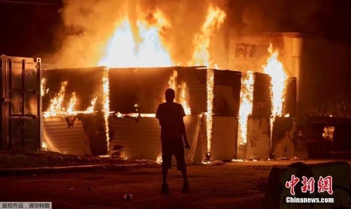 资料图:弗洛伊德之死引发了大规模抗议,有暴徒趁机纵火和抢劫。图为抗议者在明尼阿波利斯市第三警察局附近烧毁一处建筑设施。