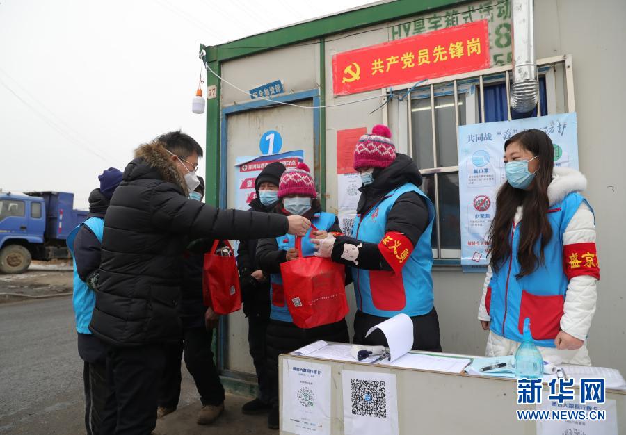 1月20日,在沈阳市和平区浑河站西街道下河湾村,街道工作人员给“盛京义勇”疫情防控志愿者送去腊八粥。