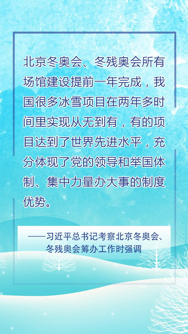 回顾过往,冬奥筹办成果显著,充分体现了我国制度优势。展望2022,我们仍要激发这一优势,凝聚亿万人民心往一处想、劲往一处使的强大合力,为北京冬奥会、冬残奥会的成功举办增光添彩。(文字:马若虎 海报:程媛媛)