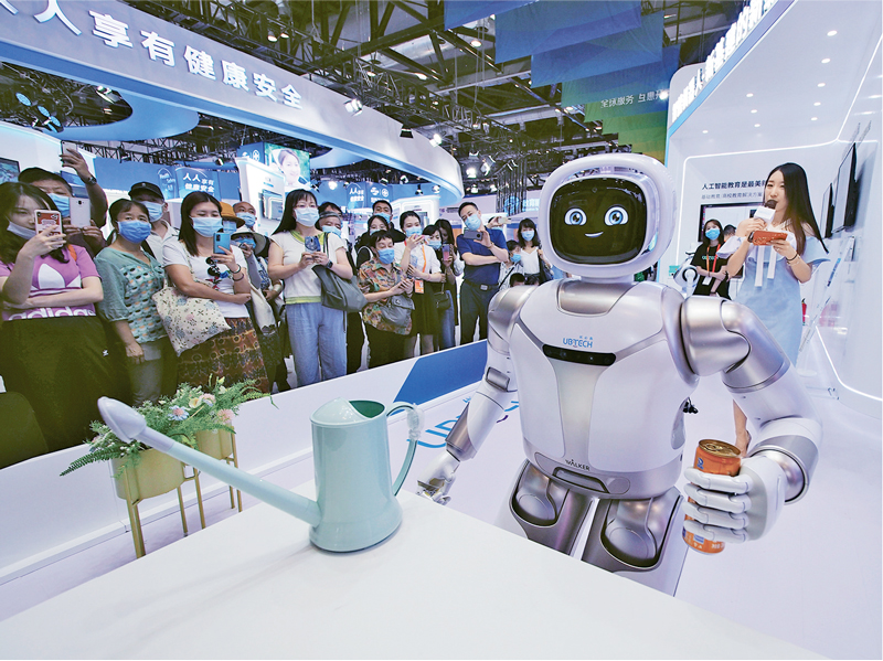 2020年中国国际服务贸易交易会于9月4日至9日在北京举行。这场盛会的举行,展现了中国应对疫情的成效、经济复苏的温度,更彰显了持续深化改革、以开放促合作的诚意和决心。图为9月9日,参观者在服贸会观看智能家居机器人的表演。 人民图片 杜建坡/摄