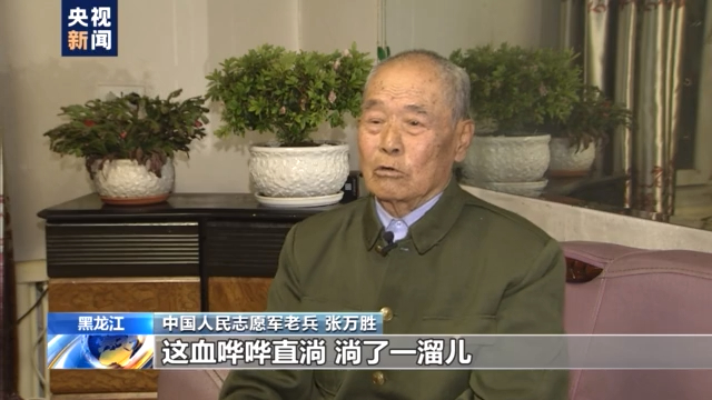 中国人民志愿军老兵 张万胜:(子弹)打我这儿,没打着,打偏了就这样,把钢盔一下打掉了。我摸摸我的头骨,这血哗哗直淌,淌了一溜儿。