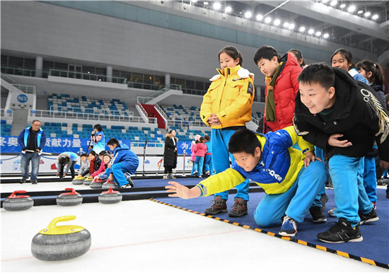 这是2019年12月10日,北京史家实验学校的学生在“冰立方”体验冰壶。新华社记者 鞠焕宗 摄