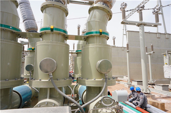 这是2019年5月8日,工人在位于河北省张家口市康保县姚家滩村的康保换流站施工。张北可再生能源柔性直流电网示范工程实现新能源大功率输出,增加北京新能源电力消费,满足冬奥会低碳绿色用电需要。新华社记者 杨世尧 摄