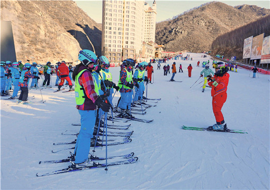 这是2019年1月7日,一名教练在张家口市崇礼区万龙滑雪场给学员讲解滑雪技巧。新华社记者 杨世尧 摄