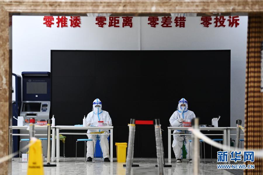 1月23日,医务人员在哈尔滨市抚顺社区核酸检测点值守。