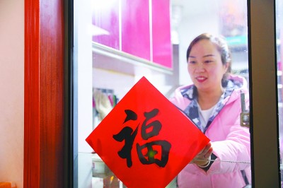 新春佳节临近,安徽省合肥市滨湖世纪社区开展“翰墨飘香迎新春”主题活动,来自社区的书法爱好者现场书写春联并送到留在合肥过年的外来务工人员家中。图为1月27日,安徽六安籍滨湖世纪社区居民张德梅在家中贴福字,今年她全家留在合肥过年。 新华社记者 曹力摄