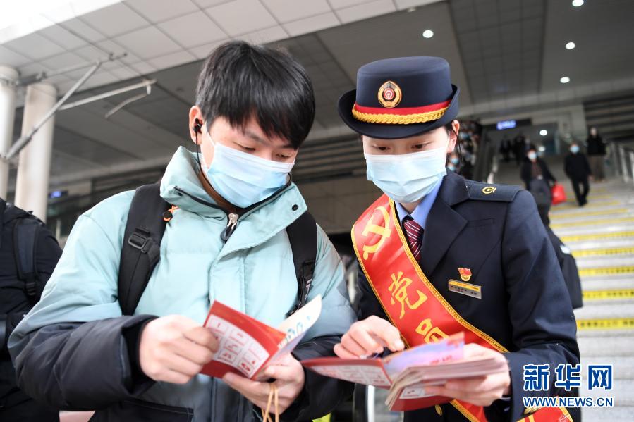 1月28日,重庆客运段工作人员在重庆北站向乘客发放安全宣传手册。