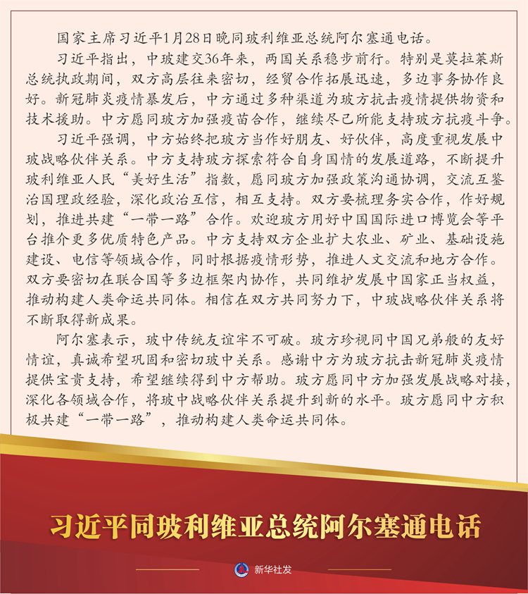 新华社北京1月28日电 国家主席习近平1月28日晚同玻利维亚总统阿尔塞通电话。