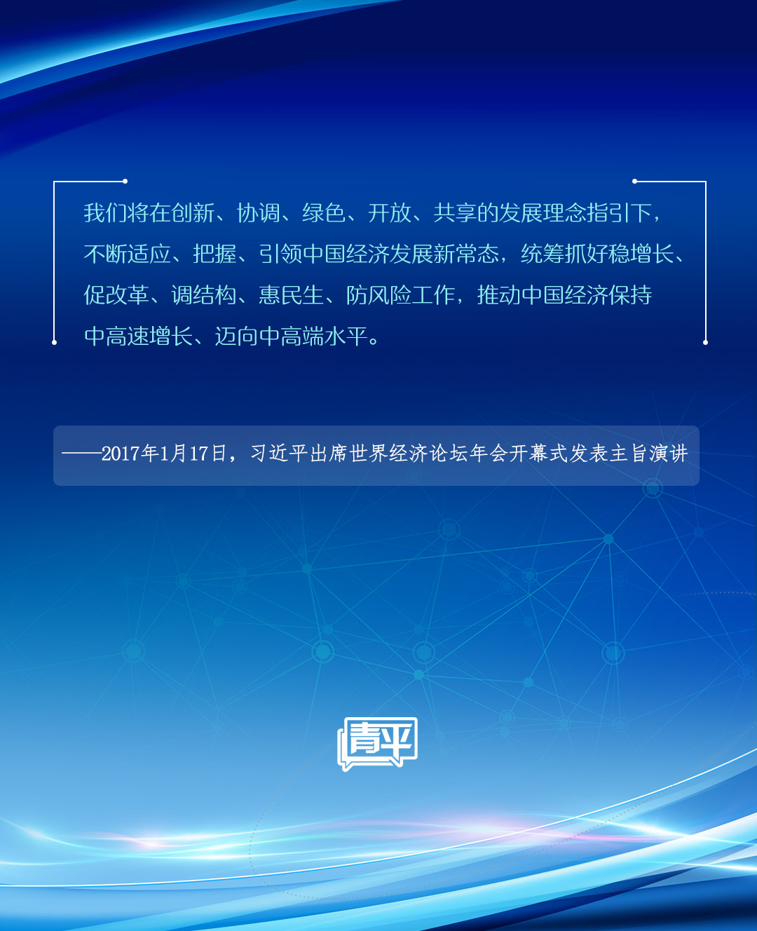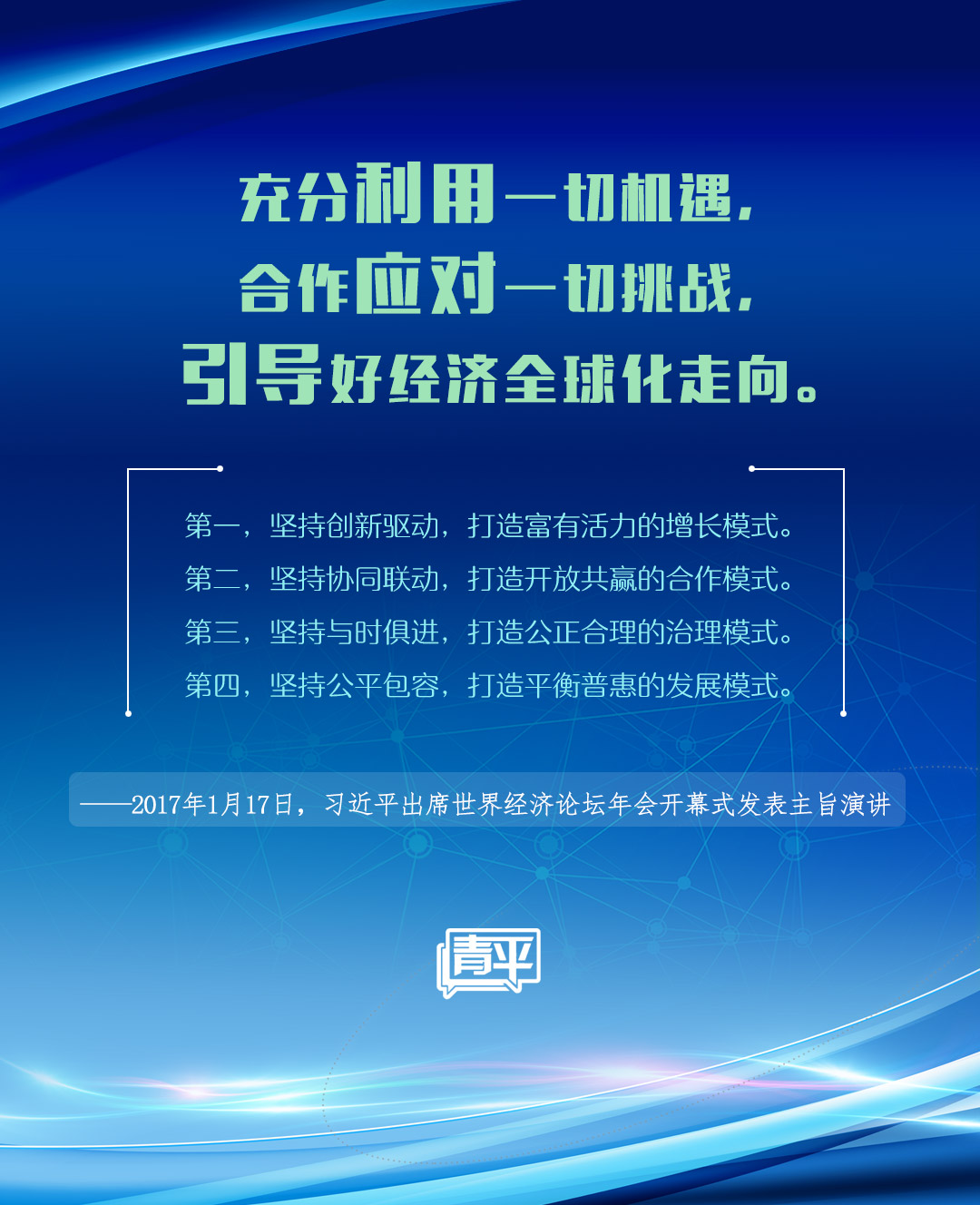 2017年,习近平主席出席世界经济论坛年会开幕式,并发表题为《共担时代责任 共促全球发展》的主旨演讲,在全球化遭遇逆流,单边主义、保护主义抬头之时,指明经济全球化的发展方向,表明了中国推动经济全球化的坚定立场。