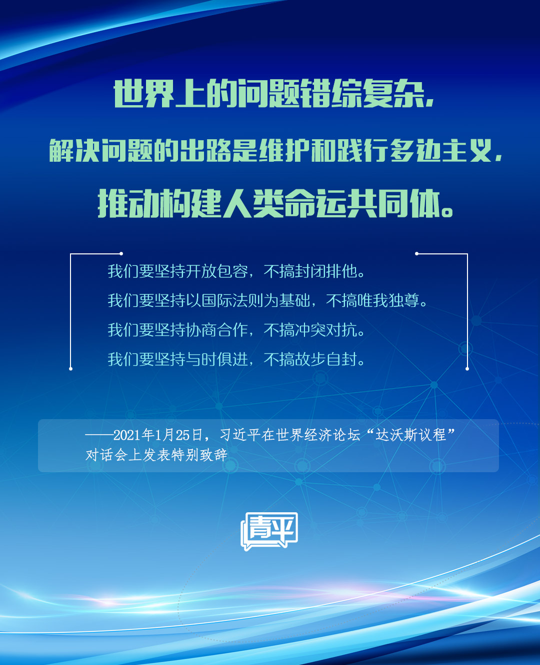时隔四年,习近平主席直面问题挑战,再次把脉时代课题、提出中国方案,中国将坚定维护和践行多边主义,推动构建人类命运共同体。特别致辞《让多边主义的火炬照亮人类前行之路》深刻阐述了时代为什么需要、以及需要什么样的多边主义,中国将如何践行多边主义,以宏阔的国际视野和高度的责任担当,廓清错误认识、厘清发展出路,为处于十字路口的世界指引前行方向。