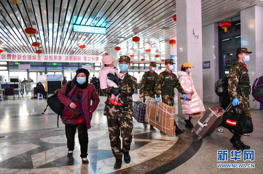 1月28日,武警甘肃总队兰州支队执勤官兵在兰州火车站帮助旅客进站。