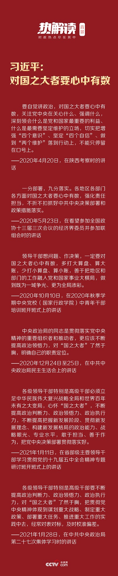 开局之年一个月内,中共中央政治局常务委员会会议、中共中央政治局会议、省部级主要领导干部学习贯彻党的十九届五中全会精神专题研讨班等,习近平总书记已四次提及“国之大者”。