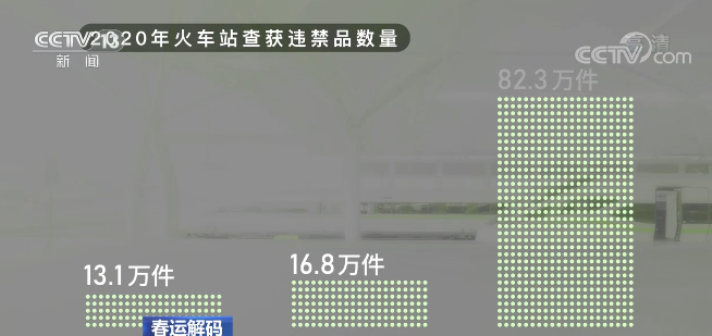 这是分别从北京西站、上海虹桥站和广州南站拿到的数据,在2020年,这三个火车站分别查获数十万件违禁品。