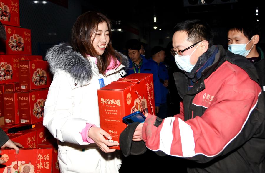1月31日,北京昌平的一家民营企业粮食蔬菜仓储车间内,留守岗位、“就地过年”的员工(右)在领取春节慰问品。新华社记者 潘旭 摄