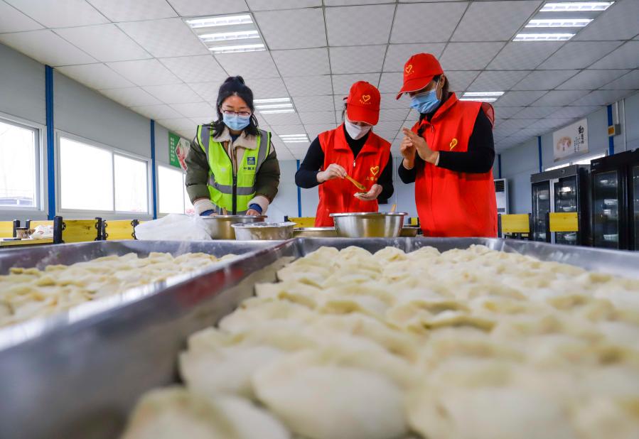 1月31日,河北唐山遵化市志愿者在京秦高速遵秦段东旧寨施工路段项目部驻地与工人一起包饺子。新华社发(刘满仓 摄)