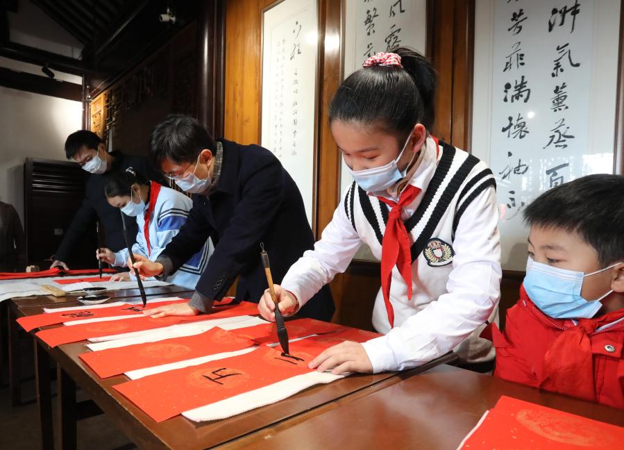 1月30日,江苏苏州园林博物馆举办的“苏州年 园林味”主题活动启动,10个就地过年的家庭成为首批体验者,孩子们与志愿者一起书写春联。新华社发(杭兴微 摄)