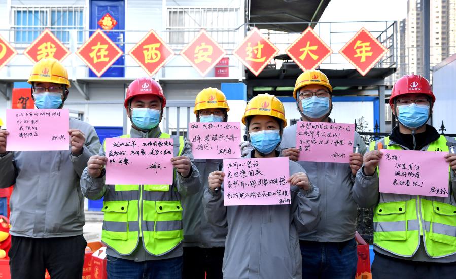 2月1日,在西安中天西北集团一住房项目建设工地,建设者写下自己想对家人说的话。新华社记者 刘潇 摄