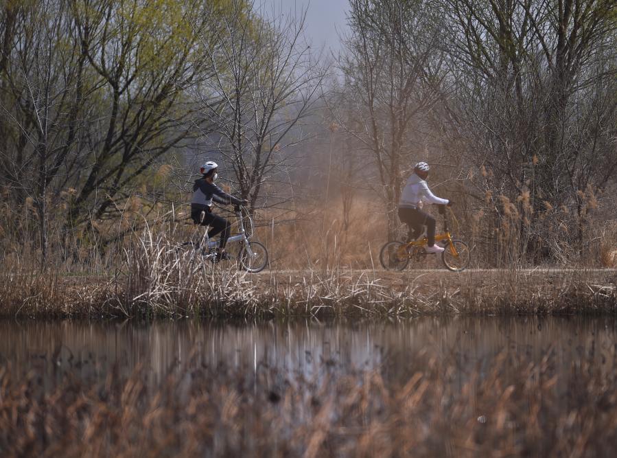2020年4月5日,游人在北京延庆野鸭湖国家湿地公园里骑行。新华社记者 陈钟昊 摄