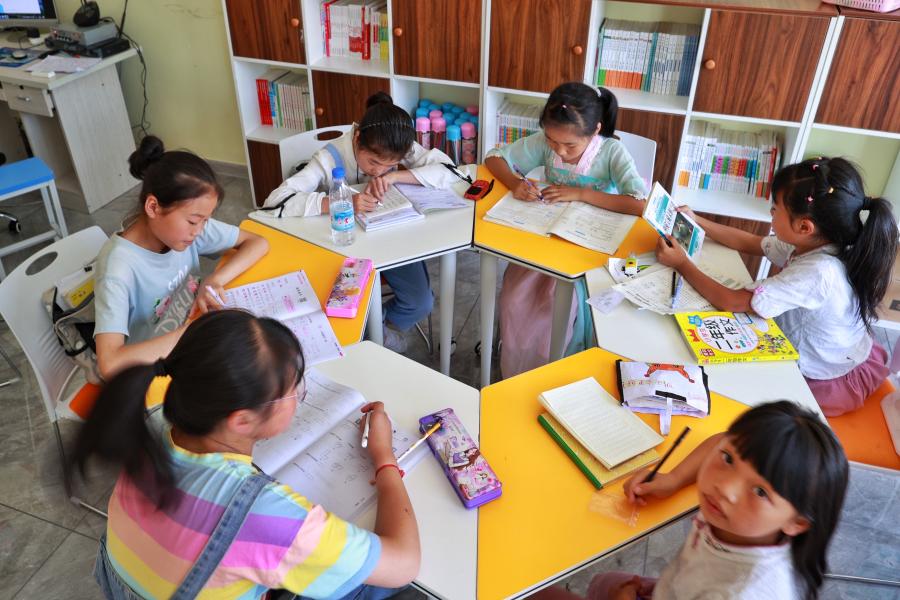 小朋友在毕节市七星关区柏杨林易地扶贫搬迁安置点长幼日间托养照料中心内学习。(新华社记者刘续 2020年8月3日 摄)