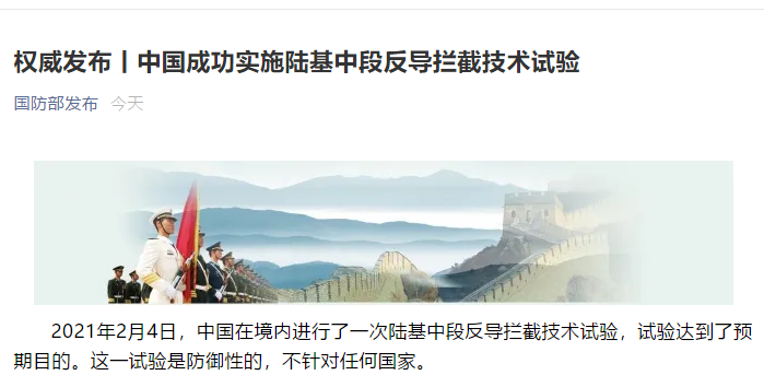 中国台湾网2月4日讯 据“国防部发布”消息,2021年2月4日,中国在境内进行了一次陆基中段反导拦截技术试验,试验达到了预期目的。这一试验是防御性的,不针对任何国家。(完)