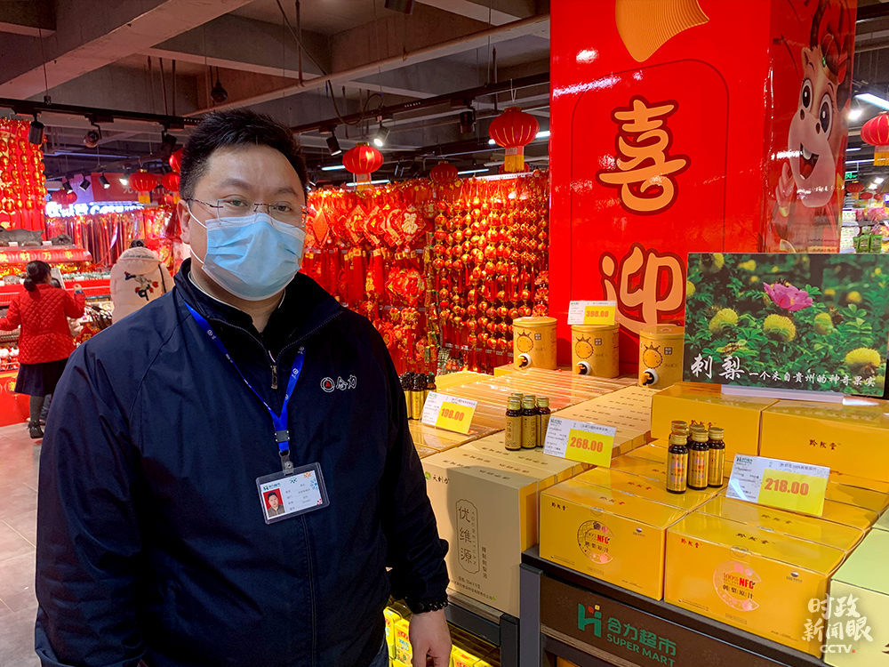 为了满足消费者就地过年的需求,超市主要增加了本地的特色产品。店长黄东告诉《时政新闻眼》,天麻、灵芝、杜仲组成的“贵州三宝”是这些天的热销商品。黄东是吉林人,他说自己也积极响应号召,今年留在贵州过年。