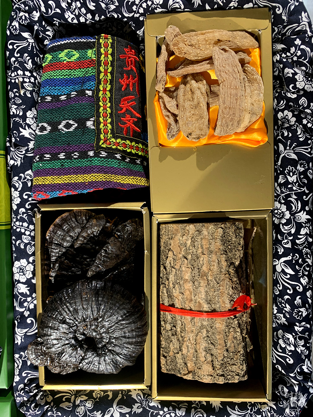 △贵州三宝,右上为天麻,下方分别是灵芝、杜仲。(总台央视记者王鹏飞拍摄)