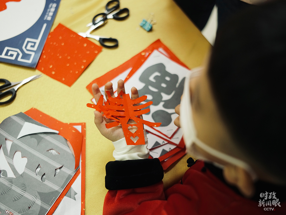 △孩子们在社区活动室练习剪纸。(总台央视记者王哈男拍摄)