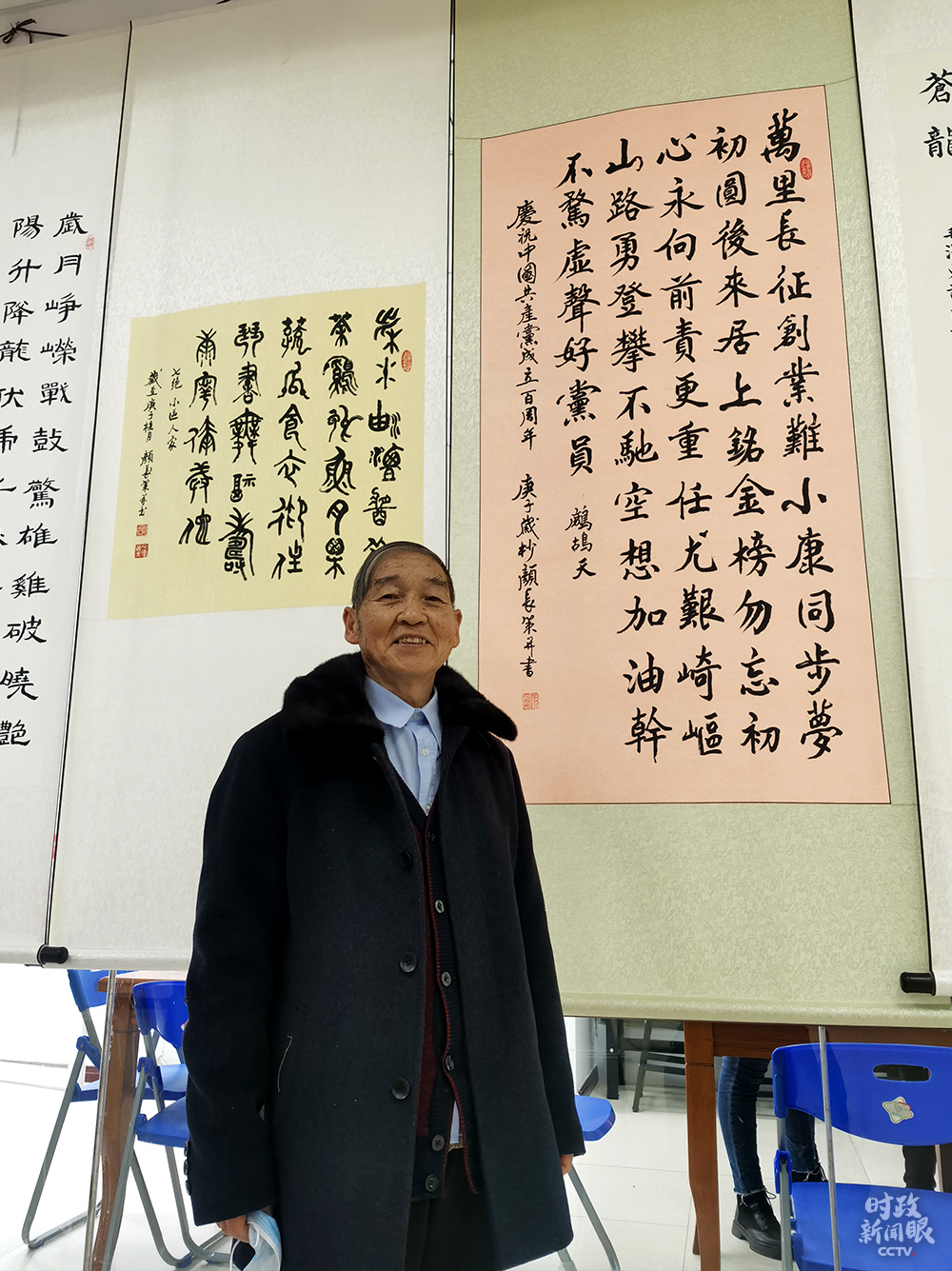 △这是87岁的社区居民颜长策老先生为庆祝中国共产党成立100周年创作并书写的诗作。(总台央视记者姚瑶拍摄)