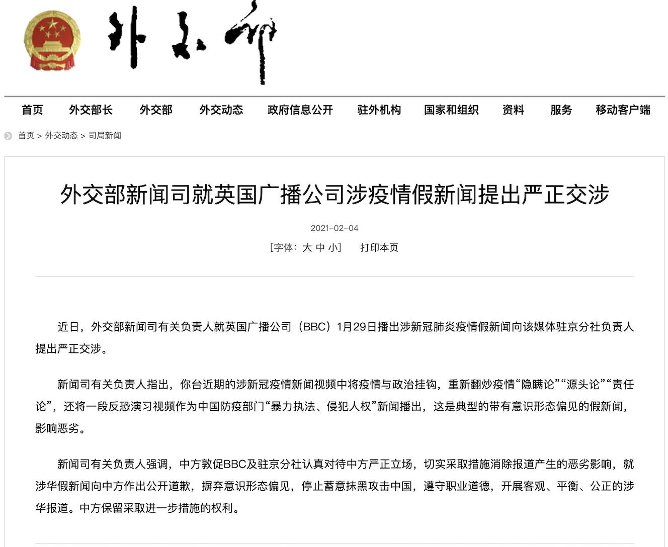 2月4日,外交部新闻司发布声明,就BBC涉疫情假新闻提出严正交涉,敦促BBC就涉华假新闻向中方作出公开道歉。