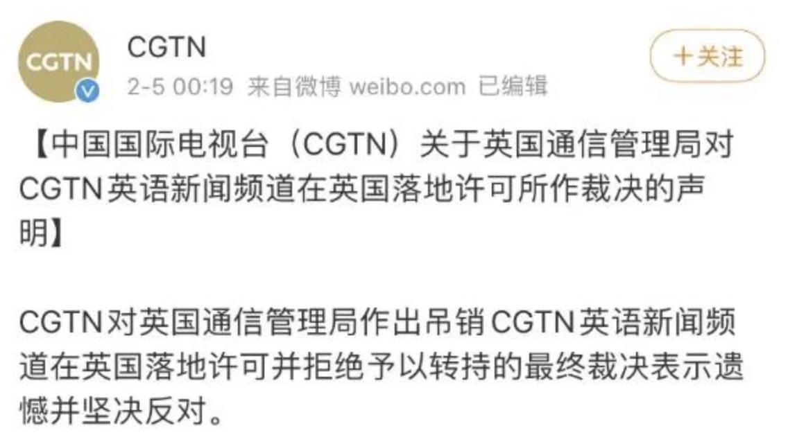 图丨英国通信管理局吊销CGTN在英落地许可的声明和CGTN的回应声明