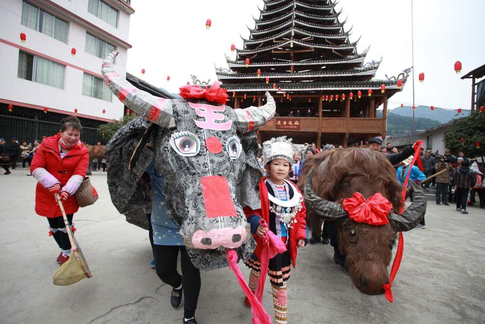 广西龙胜的侗族群众在立春当天“闹春牛”,祈求新年一帆风顺,百家幸福
