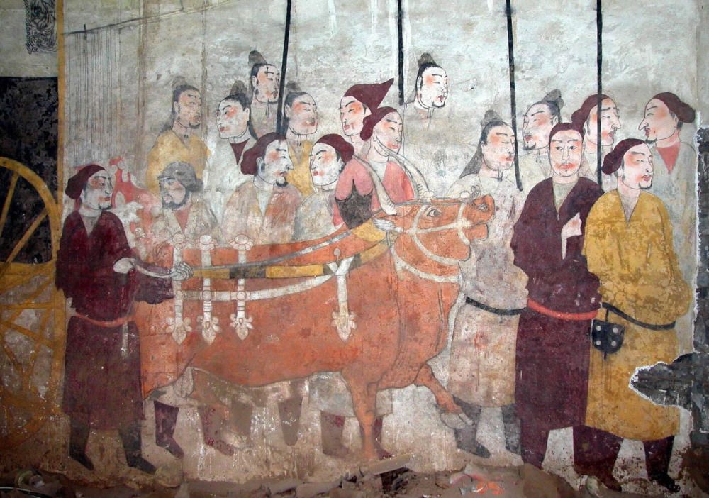 这是山西太原王家峰北朝壁画墓墓室东壁的牛车图