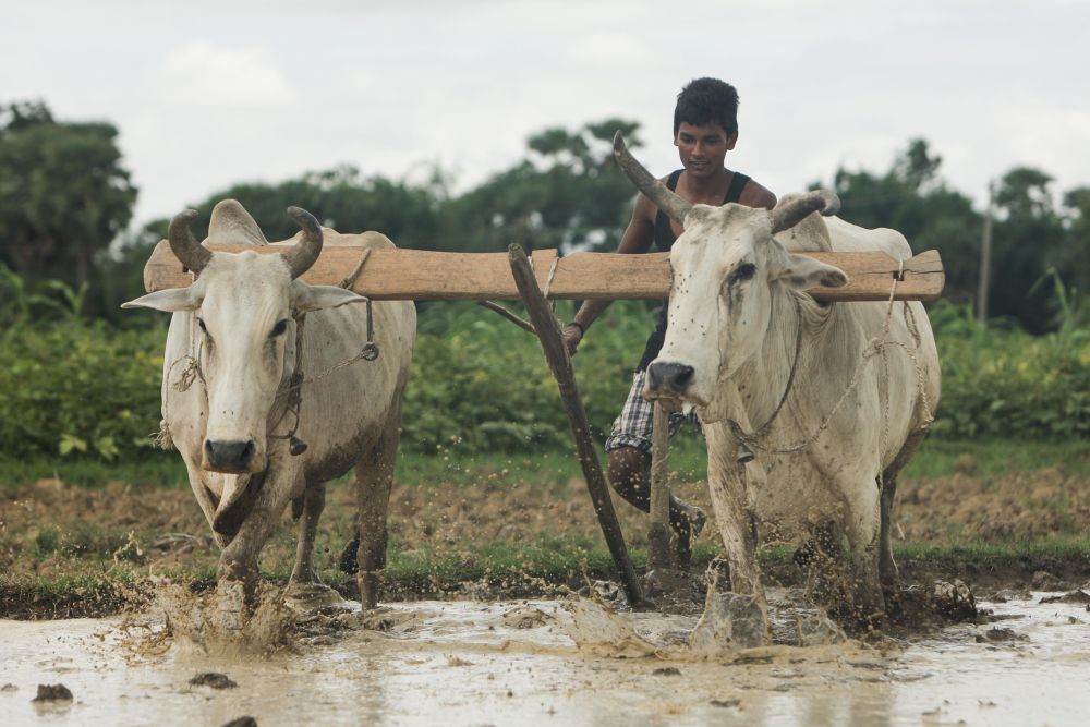 一名农民在印度比哈尔邦菩提迦耶附近的稻田里赶牛耕作
