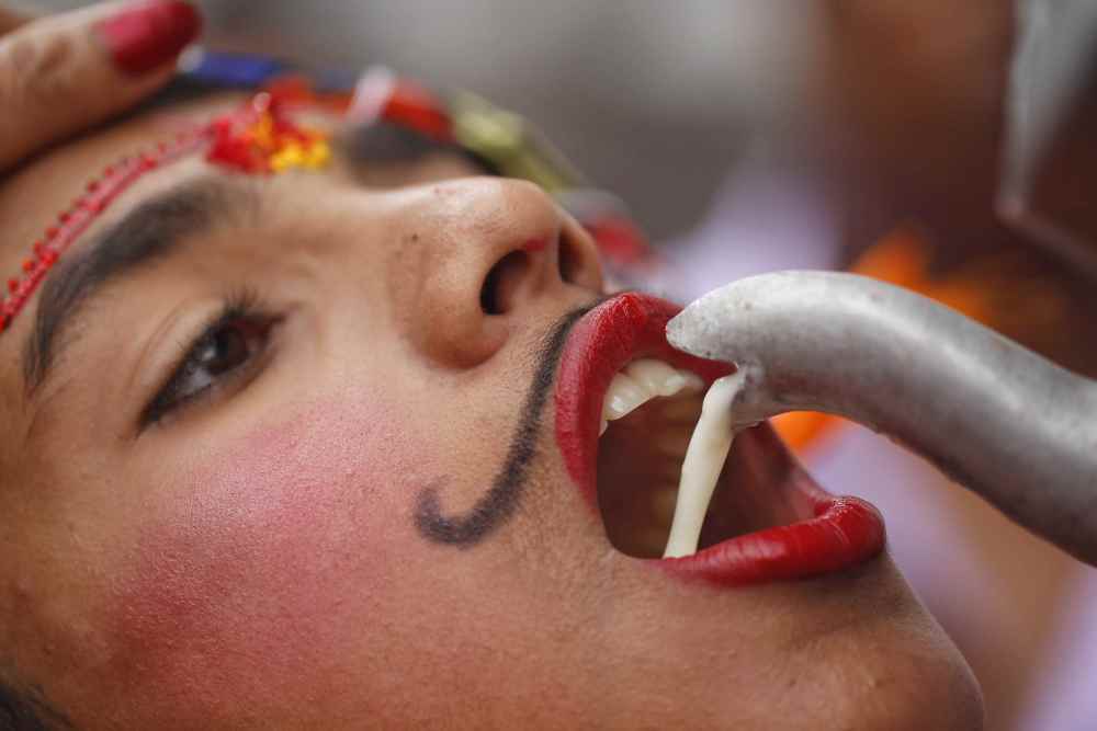 一名男孩在尼泊尔加德满都参加神牛节游行时饮用牛奶