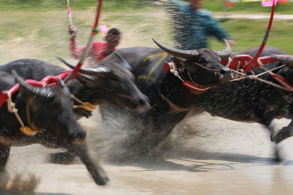 泰国春武里府每年都会举办骑牛竞速比赛以庆祝水稻丰收。