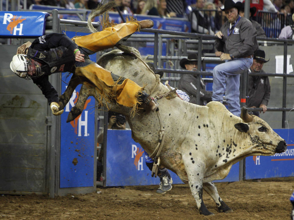一名牛仔在休斯敦牛仔节上参加骑牛比赛